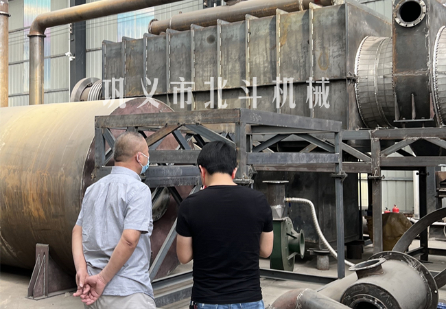 北斗機械麻桿炭化爐采用回轉(zhuǎn)式滾筒結(jié)構(gòu),開始炭化麻桿時按照一定速度旋轉(zhuǎn),麻桿在炭化爐內(nèi)翻轉(zhuǎn)流動,使炭化更均勻,大約半小時開始產(chǎn)生可燃?xì)怏w,被煙氣回收系統(tǒng)收集后作為燃料給麻桿炭化爐加熱,這時可以關(guān)閉炭化爐的點火熱源,麻桿炭化爐實現(xiàn)燃燒能源的循環(huán)利用。炭化完成后從出料口進行出炭,麻桿連續(xù)不斷進入炭化爐進行炭化,展開連續(xù)式生產(chǎn)模式。
